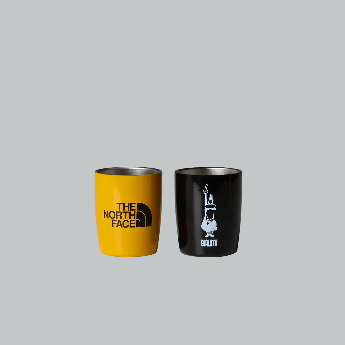 שתי כוסות נירוסטה בצבעים צהוב ושחור עם כפיות ופחית אחסון לקפה,