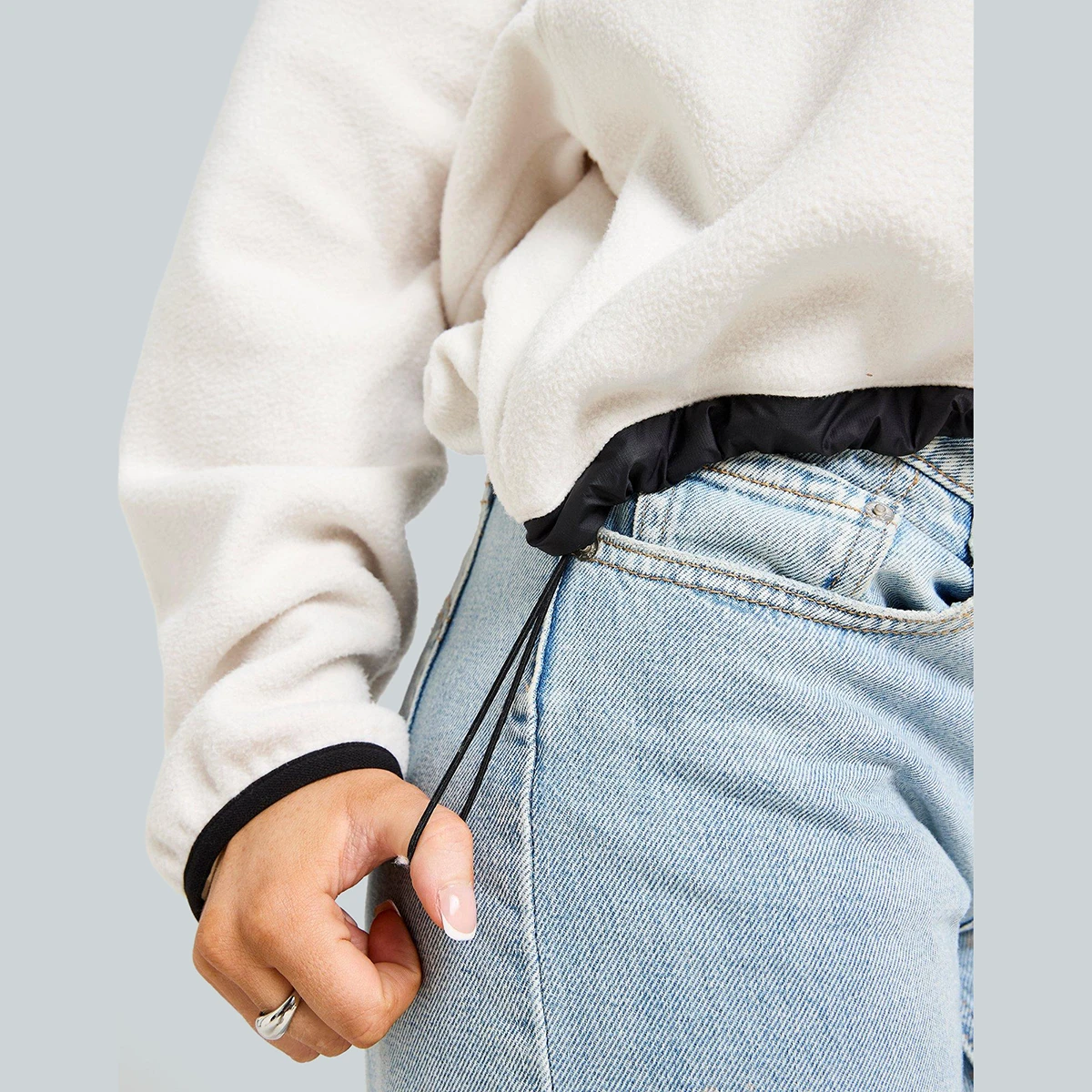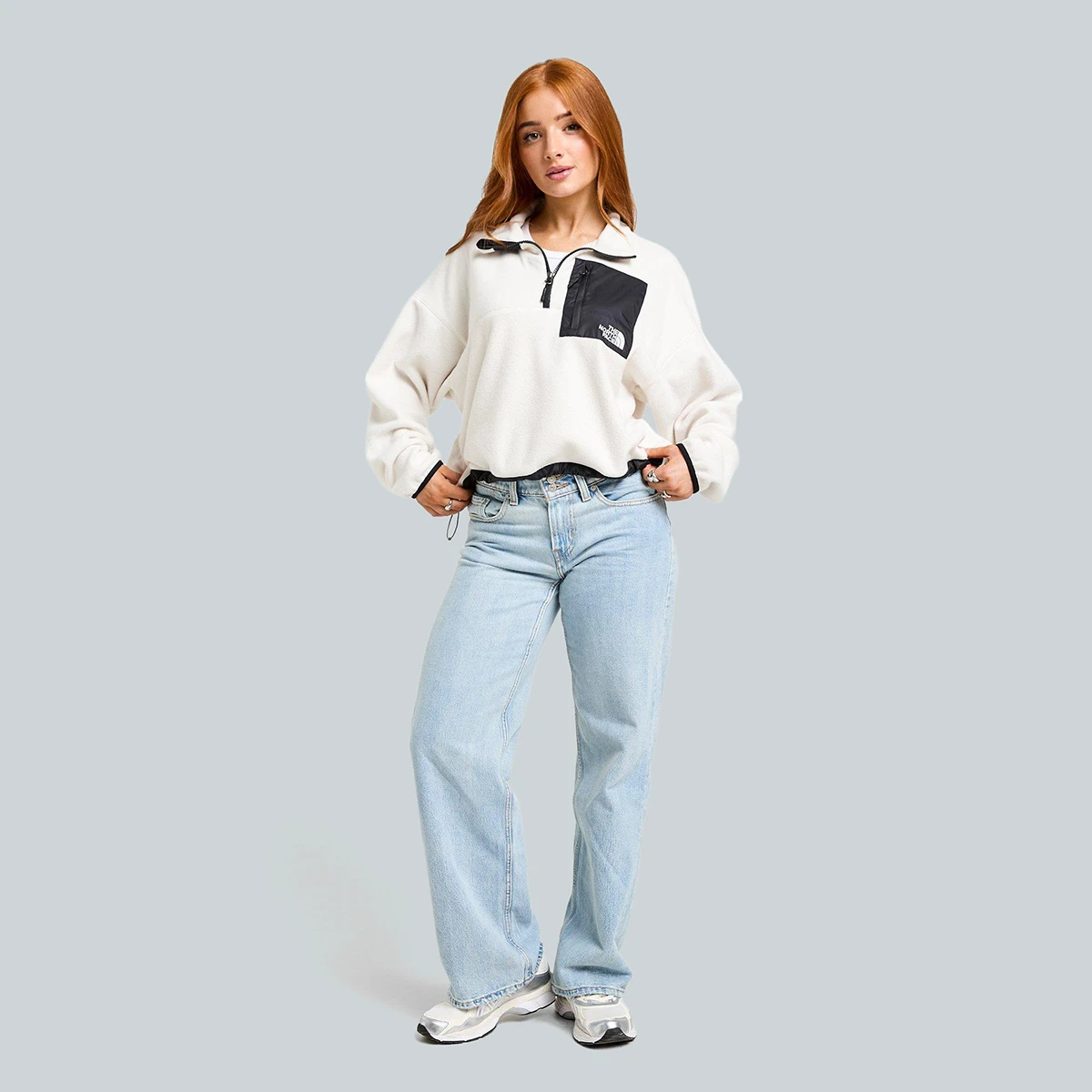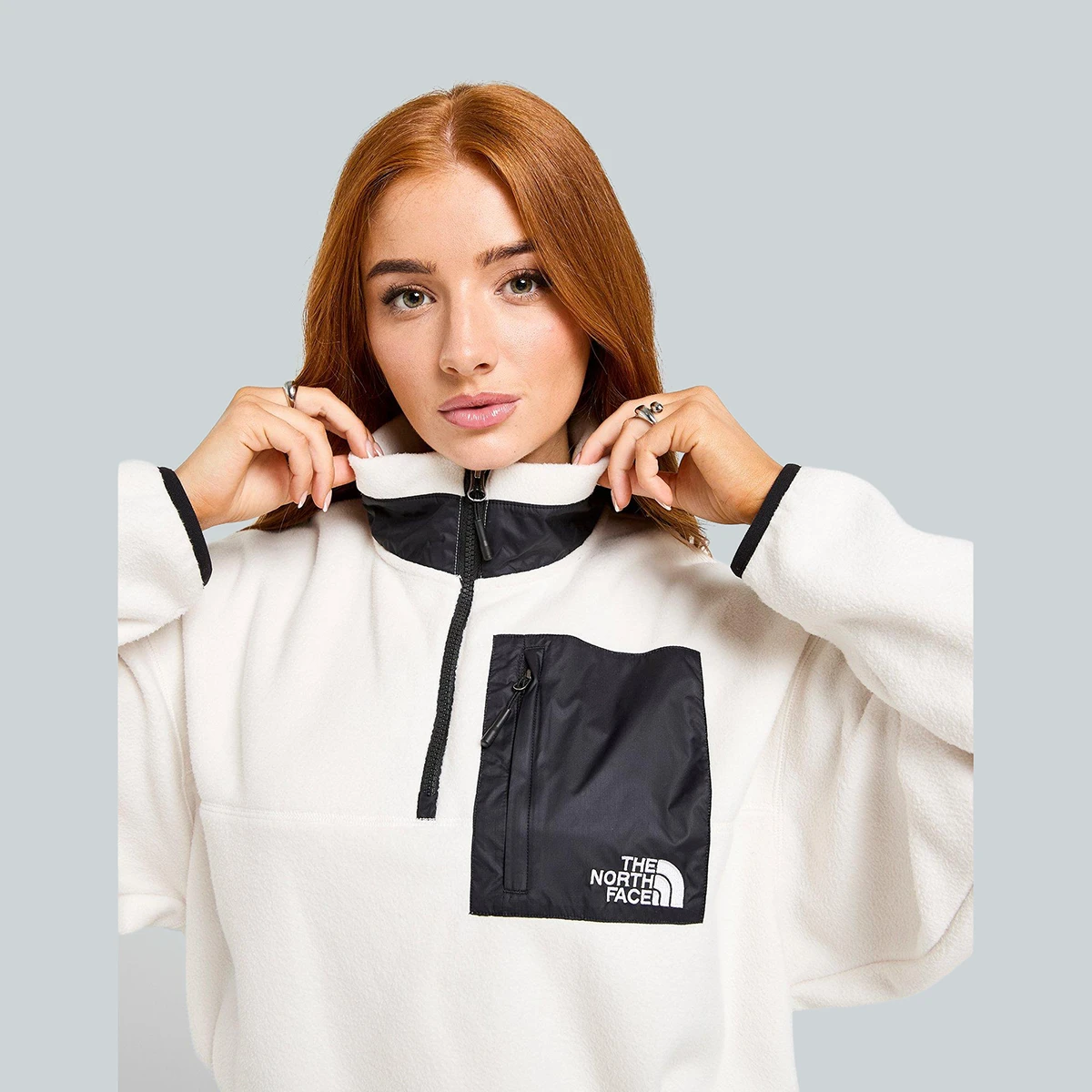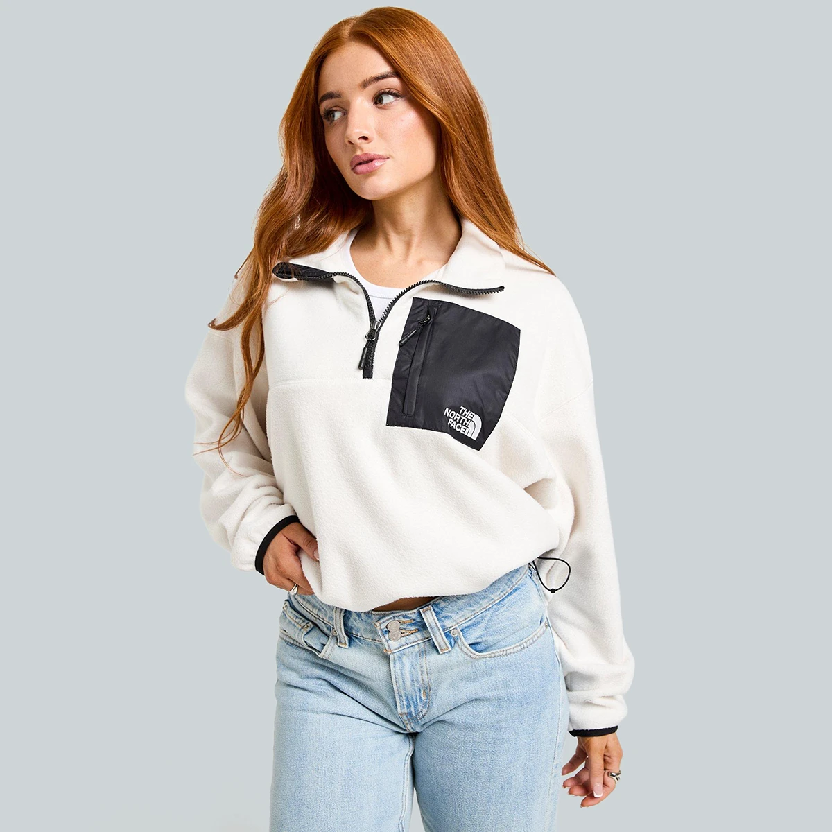 פליז הרבע־ריצ'רץ' לנשים Hangita Polar 1/4 Zip Fleece e. הפליז הפולארי בגוון אוף‑וייט כולל שכבות בד ארוגות לחיזוק ולעמידות נוספת. הוא חמים ובגזרת קרופ, כולל מכפלת עם כוונון בגומי (Bungee) להתאמה אישית. רוכסן הרבע מאפשר לשנות את צורת הצווארון והמראה.
